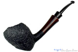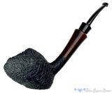 Massive in the bowl and cleaved along the side and bottom with smooth portions of straight grain concaved into the bowl and birdseye set into the flat pedestal on which the pipe sturdily sits, This majestic and grand briar from Todd Johnson has a flared rosewood ferrule of some length as a understated echo of the red tones in the stummel. The plateau rimmed bowl has plenty of growth rings winding around the sandblasted majority of the stummel's surface. Wide in the deep chamber, this smooth drawing, fantastic briar is both masculine and graceful with subtle curves and a smooth red bevel into the bowl.