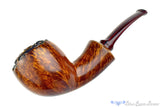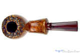 Finished in a high-grade, shiny, and contrasting smooth display of dense flame grain, this Tom RIchard freehand is constructed with thick briar walls to keep the sizeable and cylindrical chamber well insulated and almost looks as if electricity is constantly flowing through the wood. Cool in hand and mesmerizing to the eye, the large bowl is capped with the briars outer plateau and drilled deep for a long session smoker easy to maintain from start to finish. Too heavy for clenching, this German handmade is stemmed with classic red brindle and a very palm-friendly demeanor.