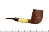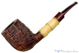 Absolutely massive in the chamber, this large sandblated billiard from Texas carver, Bill Walther, is mounted with a saddle brindle stem of cumberland and a three knuckle buddha bamboo shank. Look closely and you'll see that he also used two slim rings of briar to encase the shank and even took the time and trouble to line the bamboo mortise with a sleeve of briar, guaranteeing a sturdier fit that will always be snug. The rusty and tonal finish of the ring blasted briar suits the brindle well, and the bamboo is just the right proportion to carry this immensely sized bowl. With a smooth and open draw, this full capacity smoker will be plenty to keep the smoke puffing for several blissful hours at a time.