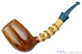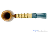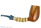 Gloriously grained featuring a tight grouping count of 4 bamboo knuckles, this nicely stacked egg from Bill Walther has a blue brindle stem, offering a varied palette of texture and color. Well designed with a flat pedestal under the bowl, this beautiful bent rests easy without any weight on the stem itself. As with all of Bill's pipes there is no bowl coat, but the draw is sublime and the celebration of color without being overly done is always welcome.