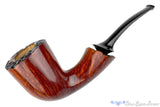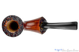 Quite a handful with a seam on each side of the cat's eye shank, this handmade smooth freehand from Texas pipe maker, Bill Walther is a substantial amount of briar and chamber. The rim and shank's face are covered with plateau and the mortise has been reinforced with brass and then rusticated to fit into the texture of the shank. Fitted with a flared saddle stem that has been sculpted to follow the contours of the transition, this smooth finished and large capacity handmade has a lean look despite its considerable size. Straight grain and auburn tones dress up the surface and the orientation is perfect for the shape of this impressive pipe.