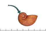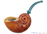 One of Bill's most popular shapes, this tan snail features a smooth, undulating rim and a jade brindle stem to set off the golden hues of the sandblast finish. Reinforced at the mortise with a ring of brass, this bent marvel has just enough bevel into the chamber to keep the gorgeous rim in stunning condition no matter how often it's smoked. Despite the weight, the crown saddle bent stem is more than enough to offset the thick walls of the articulate bowl making this stunning smoker an easy clencher to enjoy.