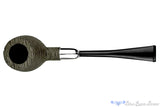 Exquisite in its classical and timeless form, this well shaped and silver mounted morta billiard from Greek pipemaker, Yorgos Mitakidis, has a stummel made from the bog oak material, but in a lesser used gray tone. The sandblasted patterns are always exceptional in this medium and Yorgos has oriented the pipe to receive radial arcs up and down the front and back of the bowl respectively. The military mounted stem offers a thin and comfortable bite for this lightweight and monochrome smoker that radiates its own straight A vibe. A deep, cylindrical chamber and an excellent draw make this handmade an obvious choice for large cuts and any favorite, tongue friendly blend.