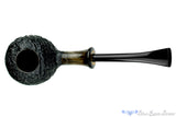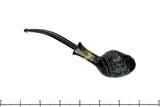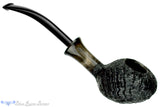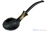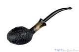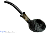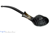 The wide fishtail stem of german ebonite is essentially a military mount style on the bent and black blasted scoop from Yorgos Mitakidis. Ferruled with a lovely piece of horn that shows off plenty of striations imbedded deeply into the material, this shank piece is reinforced with a ring of brass. Not too deep in the chamber and just perfect for enjoying a straight virginia's sweet and grassy flavors, this deeply blasted scoop shows off plenty of growth rings in the finish and like all of Yorgos' pipes, draws like a dream.