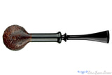 Deeply sandblasted with a perfect chamber of sweet spot sized dimensions capable of the best flavors from any blend, this very lightweight billiard sitter from Greek pipe maker, Yorgos Mitakidis, is fitted with a spectacular dark buffalo horn ferrule. Just as shiny as the polished ebonite stem, this balanced and nuance of material makes for a sleek and always shiny exterior for the pipe's shank. The fishtail stem is especially comfortable for clenching, but with such a lightweight, this virginia to Balkan blend smoker will practically disappear once its been lit and set to the task for which it was crafted.