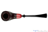 This discussion went on for far too long and we will spare you all the embarrassing details. The point is that this Dublin bowled beauty is capped at the shank with a vibrant piece of ebonite in a dark ash-rose color that brings out the red in the sandblasted stummel's finish. Over bent with a long and fancy military mounted stem, this full capacity smoker still oozes lean elegance and masculine sophistication. Well drilled with a smooth draft all the way at the very bottom, dead center on the chamber's floor, this handmade won't just always look good but will easily be a favorite smoker for both clenchers and broad cut leaf enthusiasts.