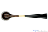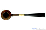Jaunty and light as a feather, this little Dublin from Italian carver Andrea Gigluicci is his entry into the ever increasing trend of lightweight, pencil shanked pipes that seems to be in resurgence (a trend we at the Blue Room are very happy to see). The brass adornment, as opposed to the ubiquitous silver, gives a warm glow to the rich chocolate stain. The result is a wonderfully inviting look.  The open draw will make this pipe great for a quick smoke break or a sipping session with a bit of folded flake. Whether you're curious about the virtues of the pencil shank, or are a fully fledged convert of the genre, this one would make a great addition to your collection.