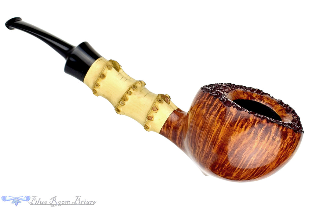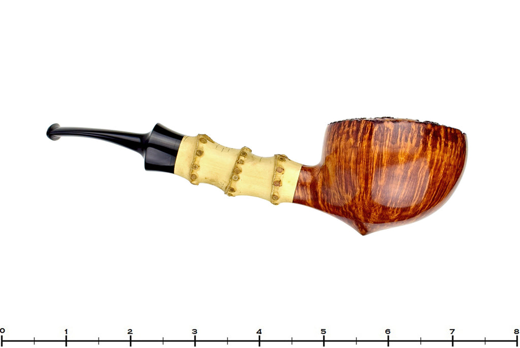 A juggernaut specimen of bamboo and briar, this smooth and spectacularly grained piece from Jesse is not his usual classic offering. A very large bowl and wide chamber is suited for the glorious straight grain he oriented into such a lovely pipe. The heirloom quality grain aside, this substantially sized pipe has three knuckles of bamboo to help keep its weight down and a very subtle bend for comfort. The nodule on the bottom is a nice touch for character, but the smooth draw on this baby is gonna produce the sweetest of smokes for generations.