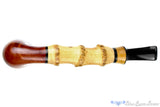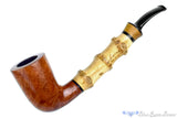 In excellent condition having only been very lightly smoked, this Molina bent dublin estate pipe from Italy has three knuckles of bamboo in the long shank and an insert of burl in the crown saddle stem. The tall bowl holds a deep chamber that cones to the draft all the way at the very bottom and provides an equally impressive smooth and open draw especially suited for topped Virginias, though any favorite blend will likely do well here in a ribbon or fine cut. Light enough to keep clenched, and the bent will help allowing the pipe to practically disappear when hanging from the jaw, this Italian bamboo's smooth finish puts it well over the top for competent and classy smoking pipe.