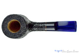 A deep sandblast finish dressed in a true black graces this stout and large bowled billiard from late American pipemaker, RC Sands. Stemmed with royal blue acrylic, this palm friendly and wonderfully thick walled smoker has a narrow and cylindrical chamber save the bottom third, which cones to the draft hole. An outstanding choice for those who prefer the sweeter Virginias and aromatic blends that burn hot without sacrificing their fingers while enjoying the tobacco.