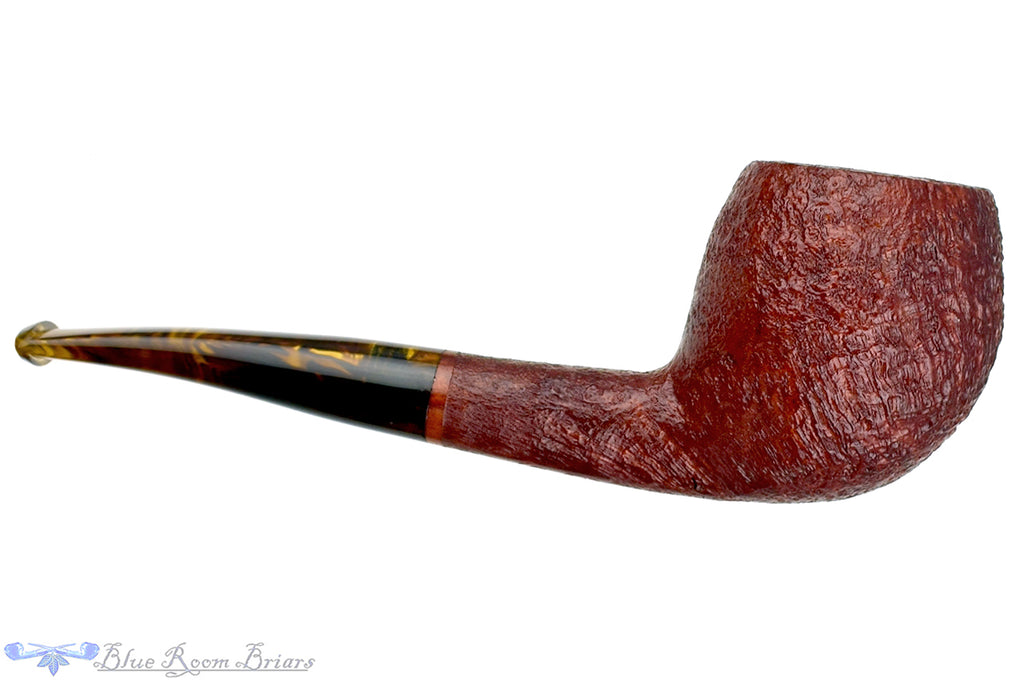 Though subtly bent, there is no mystery in this sandblast apple from Chuck Sands, finished in a rusty burgundy and featuring an acrylic tapered stem of dark, striated amber. Perfect in the draw and chamber shape, parallel sides with a rounded bottom and a draft hole dead center, this workhorse smoker is perfect for any blend that treats the tongue well, and has no bowl coat to keep from seasoning the briar over the course of many, many years of satisfying smokes. Destined to be a favorite companion, this masculine puffer is a sure bet for getting to the bottom of the bowl with as few lights as possible.