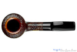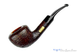 Finished in a detailed sandblast with a fetching display of contrast and topped at the rim's bevel with a smooth and polished portion that gives a touch of sophistication in addition to the weathered look of the shank and bowl, this Savinelli bent scoop estate pipe is from their 2004 Collection. Saddled to keep the weight down, this handful of thick walled Italian smoker is likely still too heavy for most to keep clenched throughout the bowl, but the acrylic stem will never oxidize and there is room for a 6mm filter for those who prefer. In excellent condition with just a touch of inner rim darkening towards the back of the bowl, this palm friendly briar has a particularly wide chamber that tapers all the way to the bottom, suggesting a favorite burley or aromatic blend.